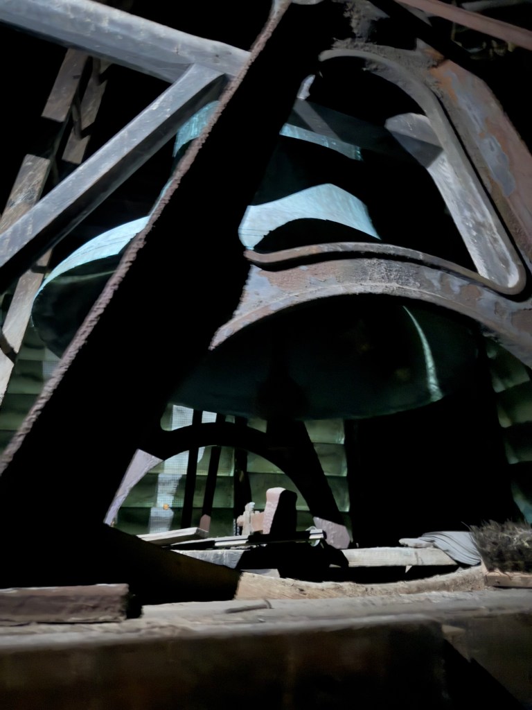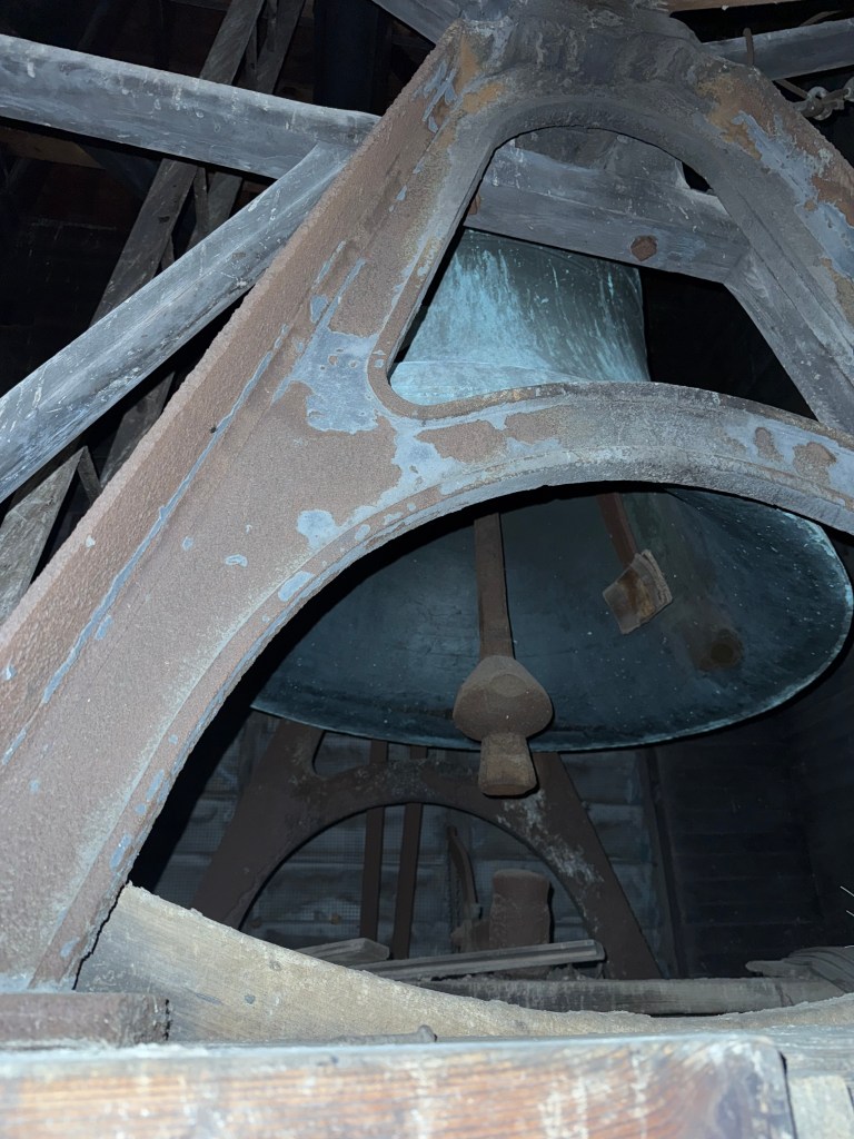 After this a comment was made about the Bell Tower and next thing I know we are walking up the creepiest stairs in the building heading to a old bell that will cause destruction if we were ever to ring it (the building is old and the supports are old). We have to file one at a time to see the bell, and while I wait I ask the new people if they believe in ghosts and I tell them quickly about the show we performed about the ghosts in the theater. Eventually I get to get up there and the bell is old and cool and I took a photo (see below). DJ knocked on the bell and it was quiet but when he must have done that when I was waiting it sounds as if he actually rang the bell. So to find that he was only using his fist was a shock.